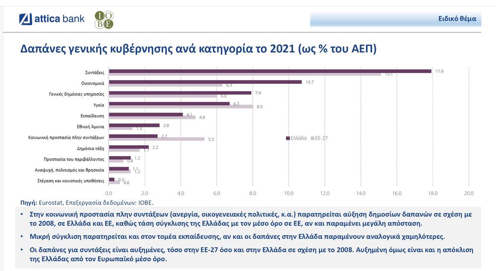 H Ελλάδα, πριν την οικονομική κρίση αλλά και μετά, διατηρεί μεγαλύτερο δημόσιο τομέα (ως % του ΑΕΠ) σε σχέση με τον μέσο όρο της Ευρωπαϊκής Ένωσης. Αναλύοντας τις δημόσιες δαπάνες ανά κατηγορία, παρατηρούνται διαφορές σε κρίσιμους τομείς όπως η εκπαίδευση και η κοινωνική προστασία πλην των συντάξεων, με την Ελλάδα να υπολείπεται και στις δύο κατηγορίες. Ωστόσο, η διαφορά ήταν μεγαλύτερη το 2008 από ό,τι το 2021.