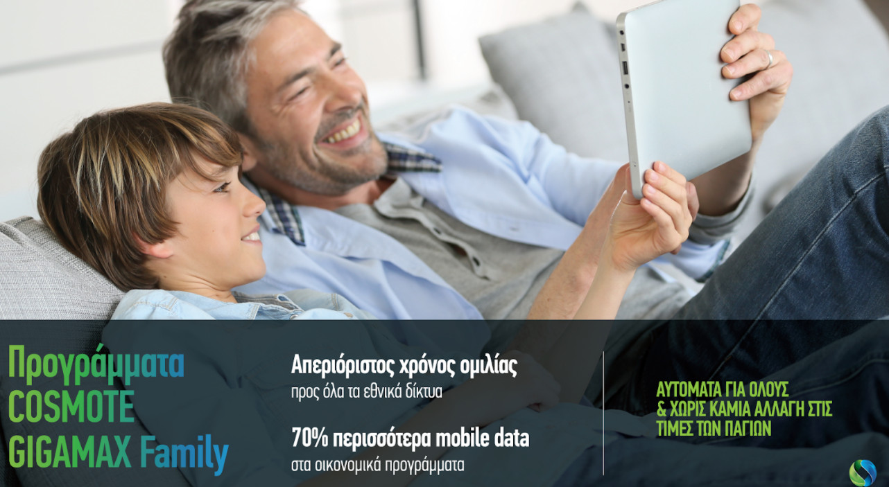 Απεριόριστο χρόνο ομιλίας προς όλα τα εθνικά δίκτυα και 70% περισσότερα mobile data προσφέρει η COSMOTE, χωρίς καμία αλλαγή στις τιμές των παγίων, σε όλους τους συνδρομητές -υφιστάμενους και νέους- των προγραμμάτων κινητής COSMOTE GIGAMAX Family S & M, απαντώντας στην ανάγκη της οικογένειας για περισσότερη επικοινωνία και χρήση Internet από το κινητό.