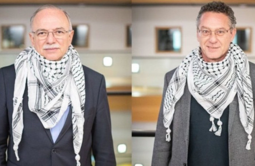 Συγκεκριμένα, οι ευρωβουλευτές του κόμματος της αξιωματικής αντιπολίτευσης, σε μια καμπάνια της Ευρωπαϊκής Αριστεράς, φωτογραφίζονται με τα παραδοσιακά μαντήλια της Παλαιστίνης.