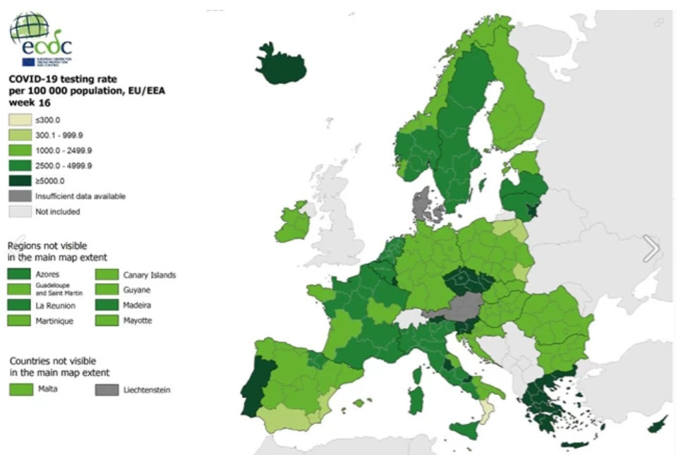 Σύμφωνα με το ECDC «πράσινο» έχουν οι χώρες εάν το ποσοστό ειδοποίησης 14 ημερών είναι χαμηλότερο από 25 περιπτώσεις ανά 100.000 και το ποσοστό θετικότητας δοκιμής κάτω από 4%. Επίσης, σε επίπεδο ελέγχων η Ελλάδα βρίσκεται στο «βαθυ πράσινο» καθώς διενεργεί πάνω από 5.000 τεστ ανά 100.000 κατοίκους, δηλαδή είναι μια από τις λίγες χώρες με τα περισσότερα τεστ στην Ευρώπη.