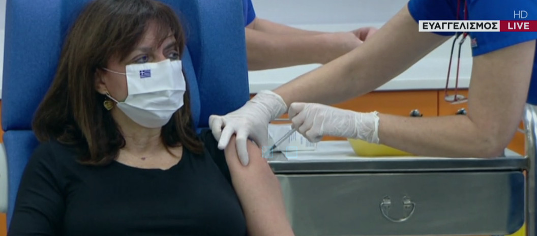 Στο νοσοκομείο Ευαγγελισμός εμβολιάστηκε και η Πρόεδρος της Δημοκρατίας, Κατερίνα Σακελλαροπούλου, ο τρίτος άνθρωπος που εμβολιάζεται κατά του κορωνοϊού στη χώρα μας, μετά τη νοσηλεύτρια Ευσταθία Καμπισιούλη και τον 88χρονο Μιχάλη Γιοβανίδη.