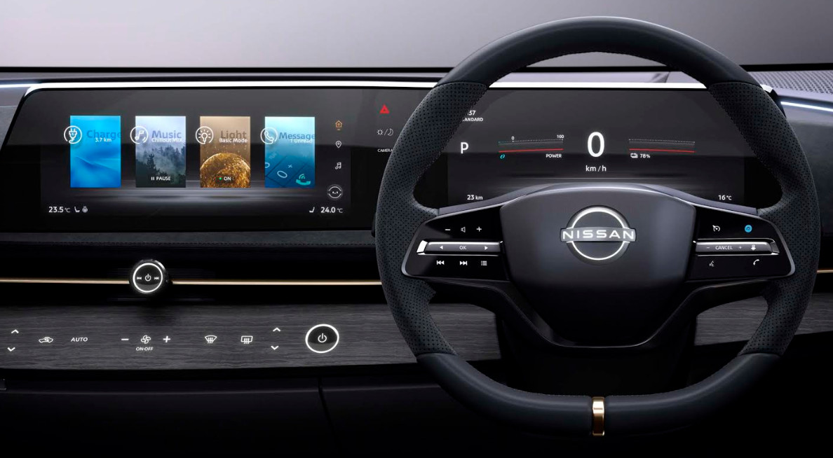 Η Nissan επέλεξε μια διαφορετική πορεία κατά την ανάπτυξη της οθόνης του Nissan Ariya Concept, δίνοντας προτεραιότητα στο σχεδιασμό, οραματιζόμενη τις τελευταίες τάσεις. Αντί ενός tablet, το ηλεκτρικό crossover έχει μια καμπυλοειδή διπλή οθόνη που θυμίζει κύμα. Προφέρει την αίσθηση του “ορίζοντα” σε όλο το αυτοκίνητο, σε συνδυασμό με το διάκοσμο από τις πόρτες, μέχρι το πίσω μέρος της καμπίνας.