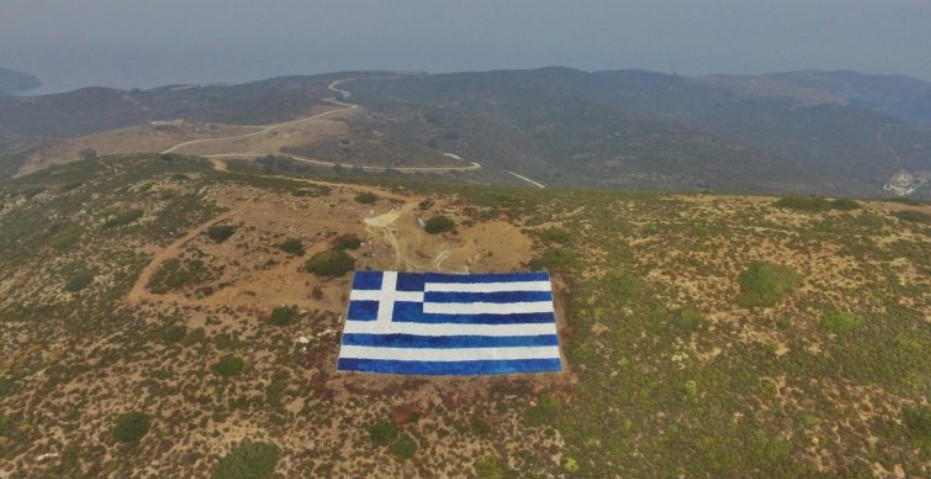 Κάτοικοι των Οινουσσών ζωγράφιζαν επί 55 ημέρες μία τεράστια ελληνική σημαία έκτασης 1,5 στρέμματος σε βουνό του νησιού, πλέον αποτελεί τη μεγαλύτερη σημαία της Ελλάδας.