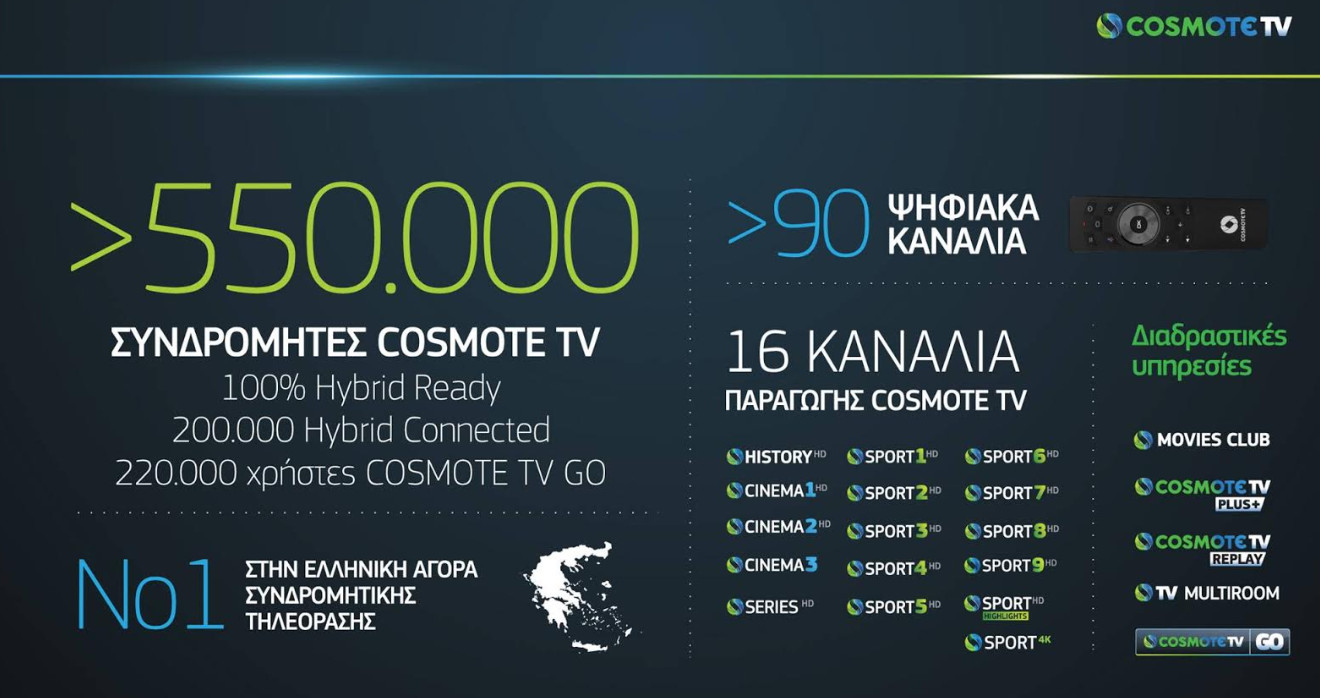 Η COSMOTE TV είναι η υπηρεσία συνδρομητικής τηλεόρασης του Ομίλου ΟΤΕ και σήμερα κατέχει την 1η θέση στην ελληνική αγορά, με πάνω από 550 χιλιάδες συνδρομητές. Λειτουργώντας αυτόνομα και ολοκληρωμένα, ως πάροχος τηλεοπτικών υπηρεσιών, προσφέρει πρόσβαση σε αποκλειστικό premium περιεχόμενο, μέσα από 16 κανάλια παραγωγής COSMOTE TV (CINEMA, SPORT, HISTORY) και είναι διαθέσιμη μέσω δορυφορικής, IPTV και OTT πρόσβασης.
