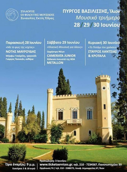 Στον Πύργο Βασιλίσσης, δίπλα στο Πάρκο Αντώνης Τρίτσης στο Ίλιον, ο Σύλλογος Οι Φίλοι της Μουσικής διοργανώνει ένα καλοκαιρινό μουσικό τριήμερο και προσκαλεί μικρούς και μεγάλους να απολαύσουν τρεις υπέροχες συναυλίες μέσα σε ένα μαγευτικό χώρο που τον αγκαλιάζει η φύση της Αττικής γης.