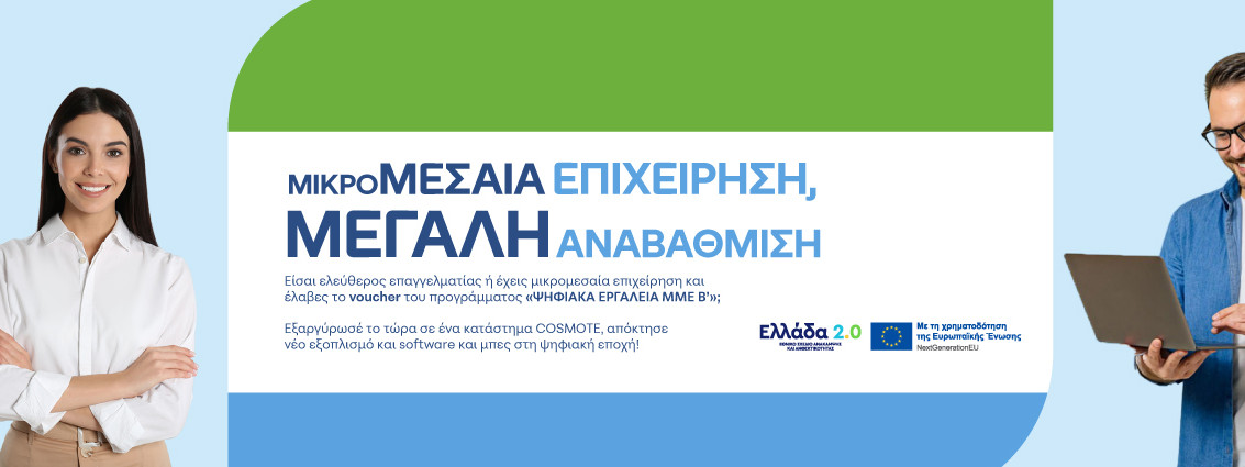 Την επιδότηση voucher έως 90% για αγορά νέου τεχνολογικού εξοπλισμού σε συνδυασμό με software μπορούν να εξαργυρώσουν στην COSMOTE και τον ΓΕΡΜΑΝΟ οι μικρομεσαίες επιχειρήσεις (ΜΜΕ) που συμμετέχουν στο πρόγραμμα «Ψηφιακά Εργαλεία ΜMΕ Β’»,της Δράσης «Ψηφιακός Μετασχηματισμός Μικρομεσαίων Επιχειρήσεων».