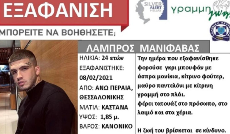 Ο Λάμπρος Μανιφάβας, 24 ετών, εξαφανίστηκε από το σπίτι του στην περιοχή Ραντάρ, στην Άνω Περαία Θεσσαλονίκης. Έχει καστανά μάτια, ύψος 1,85μ και είναι κανονικού βάρους. Την ημέρα που εξαφανίστηκε φορούσε γκρι μπουφάν με άσπρα μανίκια, κίτρινο φούτερ και μαύρο παντελόνι με κίτρινη γραμμή στο πλάι. Φέρει τατουάζ στο πρόσωπο, στο λαιμό και στα χέρια.