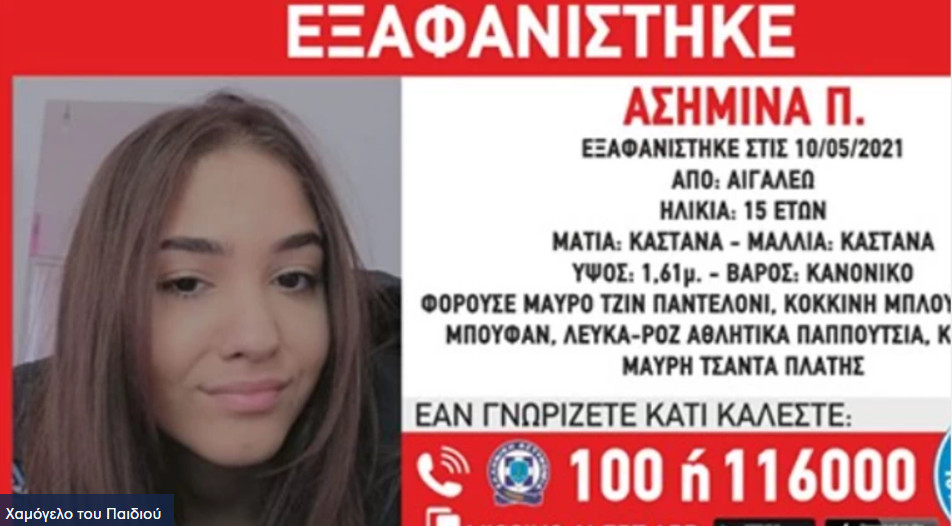 Μεγάλη κινητοποίηση των Αρχών για τον εντοπισμό της 15χρονης Ασημίνας Π. η οποία εξαφανίστηκε από το Αιγάλεω. Η ανήλικη αγνοείται εδώ και δύο ημέρες, από τις 10 Μαΐου, έχοντας σημάνει συναγερμός στην ΕΛΑΣ.