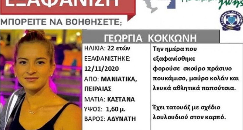 Συναγερμός έχει σημάνει στις αρχές για την εξαφάνιση νεαρής μητέρας από την περιοχή των Μανιάτικων στον Πειραιά. Πρόκειται για την Γεωργία Κοκκώνη η οποία έχει εξαφανιστεί από τις 12 Νοεμβρίου, σύμφωνα με το Silver Alert.