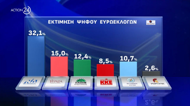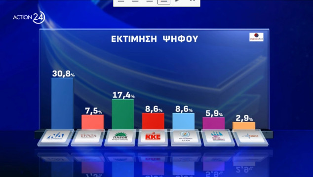 Οριακά πάνω από τα ποσοστά της των ευρωεκλογών του 2019 κατέγραψε η Opinion Poll τη Νέα Δημοκρατία στη δημοσκόπηση που παρουσιάστηκε στο κεντρικό δελτίο του Action 24. Mάλιστα, η εταιρεία δίνει άνω