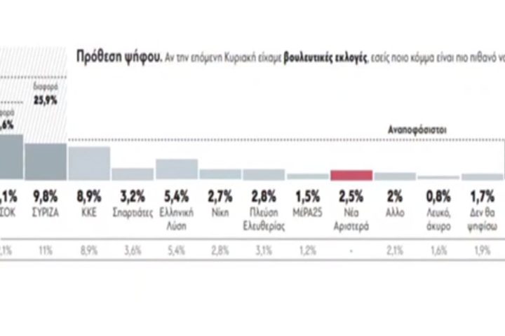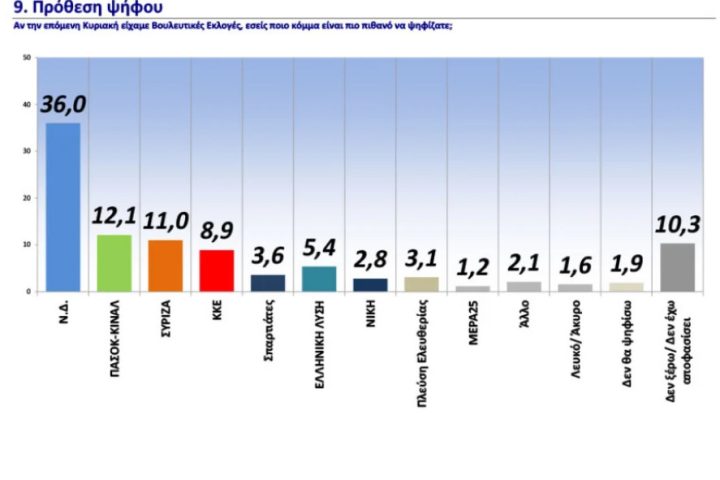 Προβάδισμα 24,1 μονάδων με βάση την πρόθεση ψήφου καταγράφει η Νέα Δημοκρατία έναντι του ΣΥΡΙΖΑ, στη δημοσκόπηση της GPO για την εφημερίδα «Παραπολιτικά».