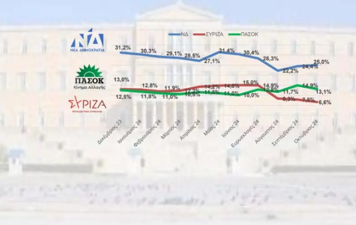 Πρωτιά της ΝΔ, δεύτερη θέση για το ΠΑΣΟΚ, χωρίς να καταγράφει κέρδη μετά την επανεκλογή Ανδρουλάκη, και υποχώρηση σε ιστορικά χαμηλά για τον ΣΥΡΙΖΑ που είναι πλέον πέμπτο κόμμα, καταγράφει δημοσκόπηση της Interview για την ιστοσελίδα
