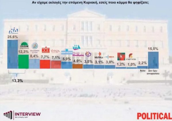Interview: Προβάδισμα 13,3 μονάδων της ΝΔ έναντι του ΠΑΣΟΚ