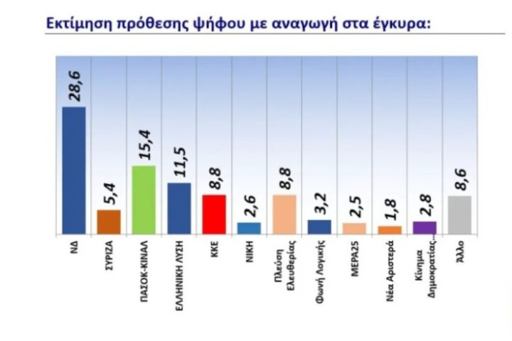 Opinion Poll: Κυριαρχία της ΝΔ στην εκτίμηση ψήφου με 30,1% – Συνεχίζει να “γκρεμίζεται” η Πλεύση Ελευθερίας