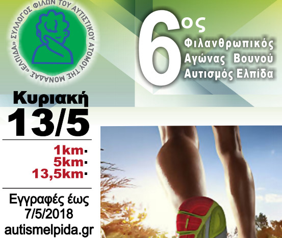 Ο Σύλλογος Φίλων Αυτιστικού Ατόμου της Μονάδας ΕΛΠΙΔΑ, υπό την αιγίδα της Περιφέρειας Κεντρικής Μακεδονίας και του Δήμου Ωραιοκάστρου και με αφορμή την Παγκόσμια Ημέρα Αυτισμού διοργανώνει τον 6ο φιλανθρωπικό Αγώνα Βουνού, με αφετηρία την Κεντρική Είσοδο της Μονάδας, οδός Στεφανίδη στο Ωραιόκαστρο, την Κυριακή 13 Μαΐου 2018.