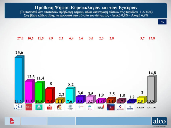 ALCO: Από 29% έως 33% η ΝΔ, από 14%-16% ο ΣΥΡΙΖΑ, στο 12%-14% το ΠΑΣΟΚ