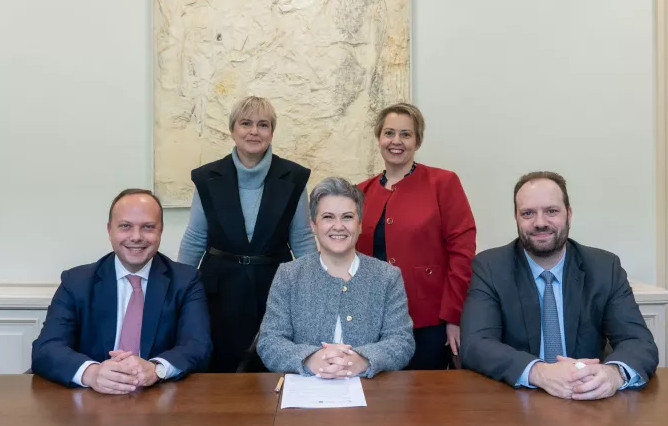 H τελετή υπογραφής της δανειακής σύμβασης με τη συγχρηματοδότηση της Alpha Bank και του ΤΑΑ πραγματοποιήθηκε στα κεντρικά γραφεία της Τράπεζας, παρουσία του Ορέστη Καβαλάκη Διοικητή της Ειδικής Υπηρεσίας Συντονισμού Ταμείου Ανάκαμψης (ΕΥΣΤΑ), του Ισίδωρου Πάσσα, Chief of Retail Banking της Alpha Bank, του Αλέξανδρου Τόλια, Small Business Banking Director της Τράπεζας και του Γιώργου Ραπανάκη Branch Network Regional Director.