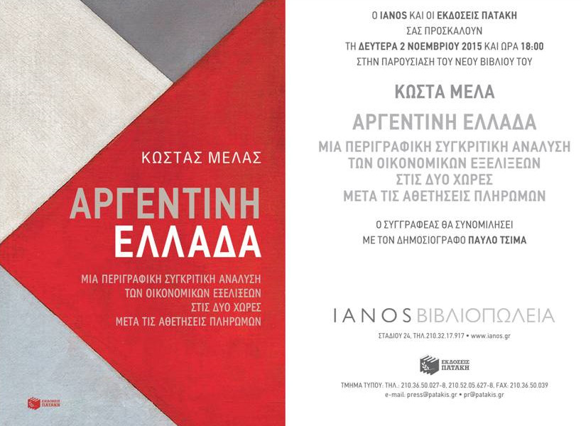 Tο καινούριο του βιβλίου με τίτλο “Αργεντινή Ελλάδα – Μια περιγραφική συγκριτική ανάλυση των οικονομικών εξελίξεων στις δύο χώρες μετά τις αθετήσεις πληρωμών” παρουσιάζει σήμερα στο βιλιοπωλείο ΙΑΝΟΣ ο Κώστας Μελάς και ώρα 18.00.