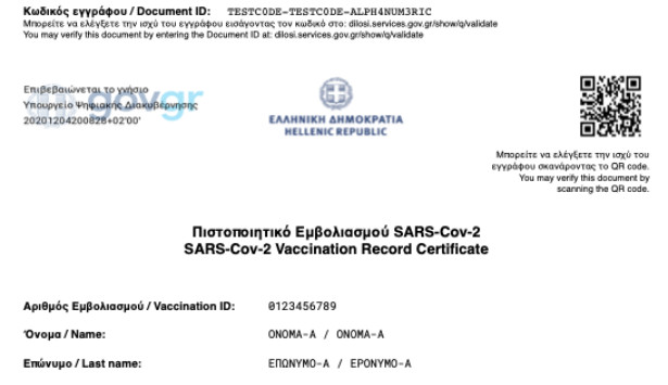 Αυτό είναι το ψηφιακό πιστοποιητικό που θα λαμβάνει ο πολίτης μετά την ολοκλήρωση του εμβολιασμού του κατά της νόσου covid-19.