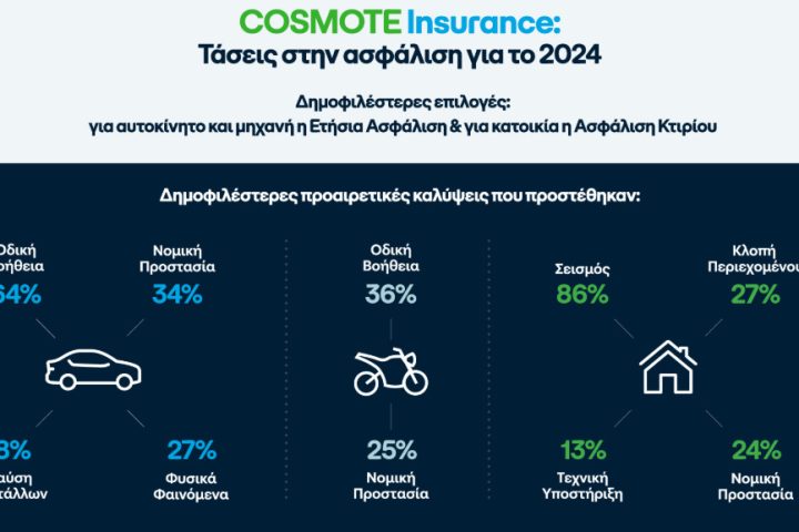Τις τάσεις της ασφαλιστικής αγοράς καταγράφει το COSMOTE Insurance, αναλύοντας τις επιλογές χιλιάδων πελατών του που επέλεξαν ασφάλιση αυτοκινήτου, μηχανής ή κατοικίας το 2024.