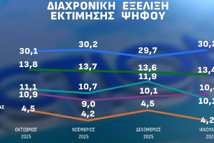 Η Ν.Δ ανεβαίνει κατά 0.5% σε σχέση με την έρευνα του Ιανουαρίου, καλύπτοντας απώλειες της περιόδου των αγροτικών κινητοποιήσεων, δείχνοντας σημαντική αντοχή  και βρίσκεται στην εκτίμηση ψήφου στο 30.2% έχοντας διαφορά από