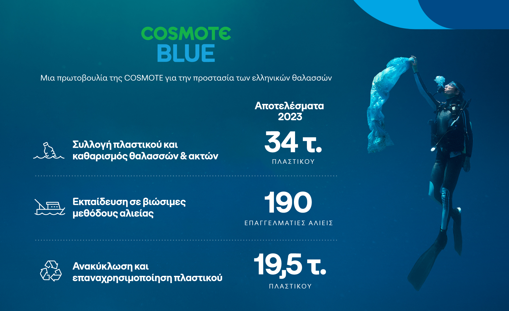 Από την έναρξη της πρωτοβουλίας COSMOTE BLUE επαγγελματίες αλιείς πραγματοποίησαν δράσεις καθαρισμού και συγκέντρωσαν 34 τόνους πλαστικού από τις θαλάσσιες περιοχές και ακτές του Θερμαϊκού, της Χαλκιδικής και του Αργοσαρωνικού κόλπου, με 40 αλιευτικά σκάφη. Επίσης, 190 επαγγελματίες ψαράδες εκπαιδεύτηκαν σε βιώσιμες μεθόδους αλιείας και σε καλές πρακτικές καθαρισμού των θαλασσών και των ακτών.