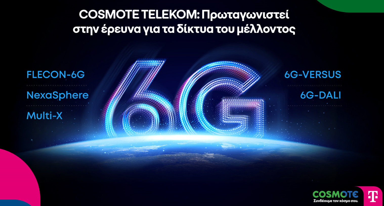 Με την ενεργό συμβολή της σε 15 ερευνητικά έργα για το 6G συνολικά, η COSMOTΕ TELEKOM ενισχύει τον ρόλο της στην διαμόρφωση του 6G οικοσυστήματος, συμμετέχοντας στην ανάπτυξη και αξιολόγηση μελλοντικών τεχνολογικών λύσεων, εμπορικών εφαρμογών και καινοτόμων επιχειρηματικών μοντέλων σε τομείς όπως τα AI-native δίκτυα, οι ενεργειακά αποδοτικές αρχιτεκτονικές, η ασφάλεια και οι κβαντικές επικοινωνίες.