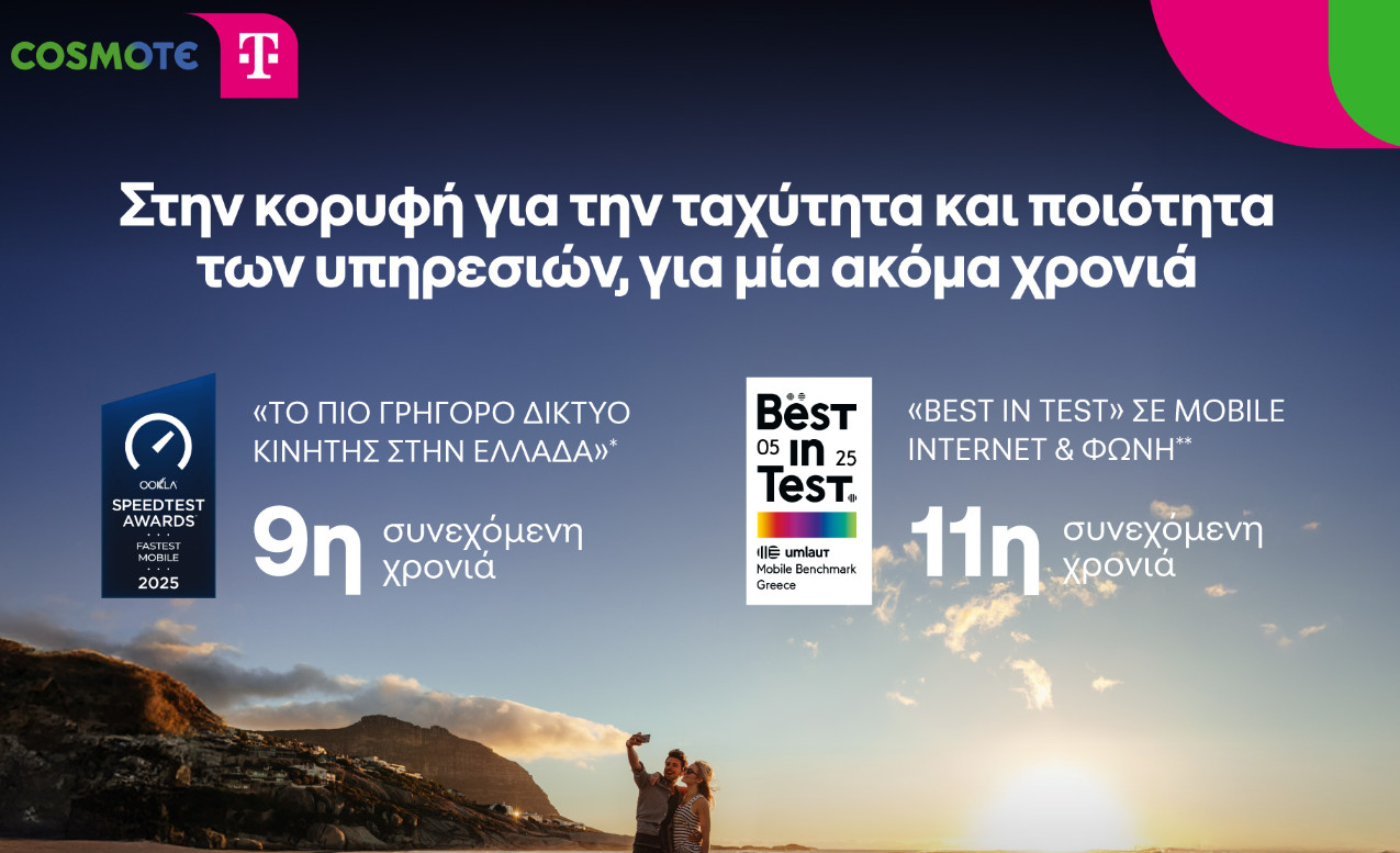 Η COSMOTE TELEKOM επιβεβαιώνει για ακόμη μία φορά την υπεροχή του δικτύου της, καταγράφοντας σημαντικές διακρίσεις για την ταχύτητα και ποιότητα των υπηρεσιών κινητής. Σύμφωνα με το Speedtest™ της Ookla®, το δίκτυο COSMOTE TELEKOM αναδείχθηκε «το πιο γρήγορο δίκτυο κινητής στην Ελλάδα» (Greece’s Fastest Mobile Network 2025) για 9η συνεχόμενη χρονιά.
