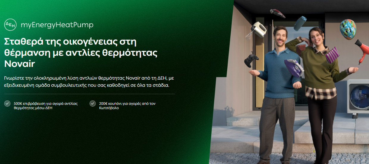 Το ΔΕΗ myEnergy HeatPump παρέχει μία ολοκληρωμένη λύση για την πλήρη αναβάθμιση του συστήματος θέρμανσης και ψύξης, με μελέτη, εγκατάσταση και τεχνική υποστήριξη από εξειδικευμένους συνεργάτες της ΔΕΗ, διασφαλίζοντας διαφάνεια και αξιοπιστία σε κάθε στάδιο της διαδικασίας, από την αρχική προσφορά έως και μετά την ολοκλήρωση της εγκατάστασης του συστήματος. Οι αντλίες θερμότητας Novair εξασφαλίζουν εξοικονόμηση ενέργειας έως και 70% σε σχέση με τα συμβατικά συστήματα, μειώνουν τις εκπομπές CO₂ και προσφέρουν υψηλή ενεργειακή κλάση (A+++), με δυνατότητα απομακρυσμένου ελέγχου, αποκλειστικά μέσα από τον ψηφιακό σύμβουλο ΔΕΗ myEnergy Coach. Έτσι, η διαχείριση της ενέργειας γίνεται εύκολη και πλήρως προσαρμοσμένη στον τρόπο ζωής κάθε νοικοκυριού.