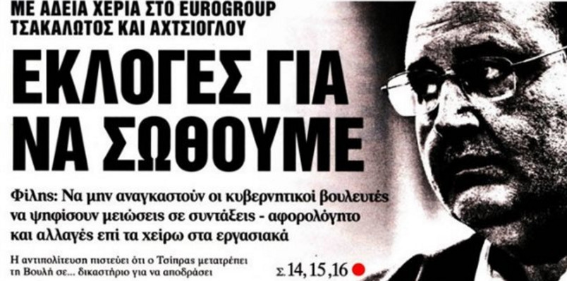 Σε διάψευση πρωτοσέλιδου δημοσιεύματος της εφημερίδας Ελευθερία του Τύπου προχώρησε ο βουλευτής του ΣΥΡΙΖΑ Νίκος Φίλης. Στην εφημερίδα ο κ. Φίλης εμφανίζεται να λέει «Εκλογές για να σωθούμε», προσθέτοντας «να μην αναγκαστούν οι κυβερνητικοί βουλευτές να ψηφίσουν αλλαγές επί τα χείρω σε συντάξεις – αφορολόγητο και αλλαγές επί τα χείρω στα εργασιακά».