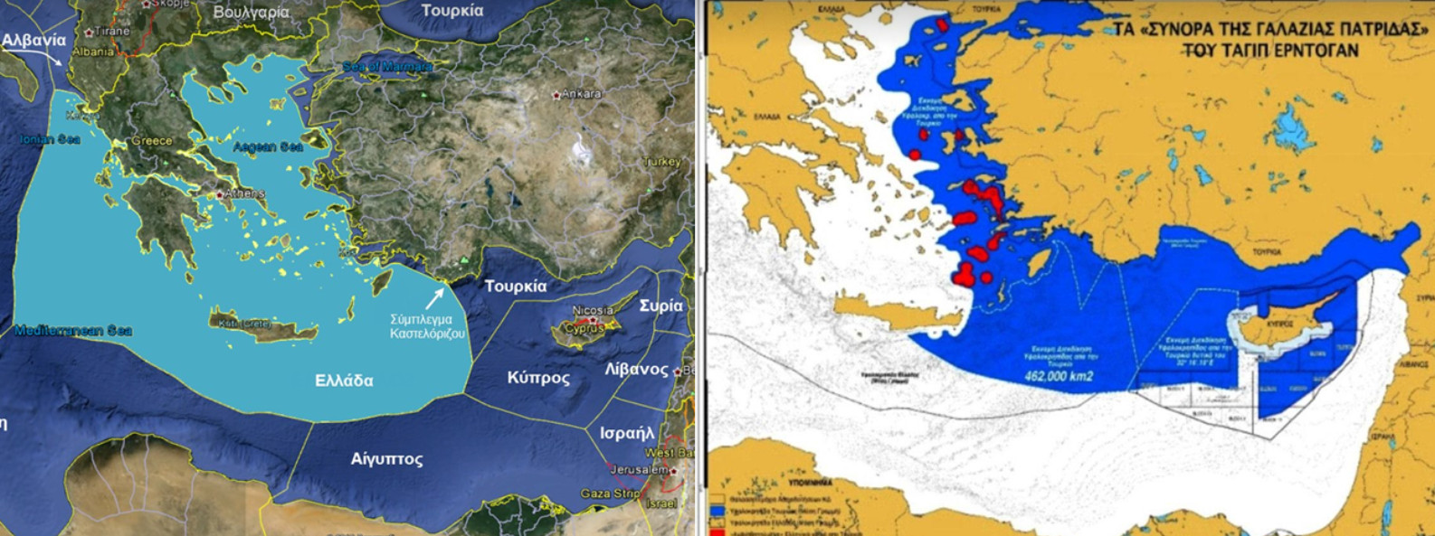 • Η μεν Ελλάδα ισχυρίζεται ότι τα νησιά της έχουν πλήρη «Αποκλειστική Οικονομική Ζώνη» (ΑΟΖ) η οποία μάλιστα και κατά ένα ανεξήγητο τρόπο υπερτερεί της αντίστοιχης ΑΟΖ της ηπειρωτικής Τουρκίας (βλ. αριστερό χάρτη).