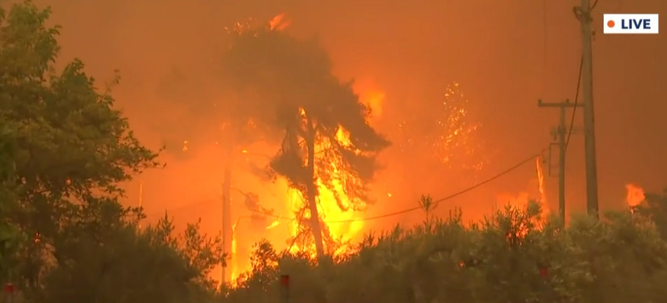 Τρομακτικές είναι οι εικόνες που μεταδίδει το OPEN από το Πευκί, όπου ήδη έχουν τυλιχτεί στις φλόγες σπίτια.
