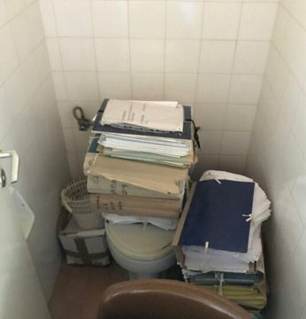 Νομίζεις δικαστή μου, ότι είσαι κατάλληλος/η για άλλη θέση του Δημοσίου; Απόδειξέ το! Απολύσου τώρα από το δικαστικό σώμα, βρες κανέναν πελάτη ως δικηγόρος, βγάλε κανένα φράγκο στην ελεύθερη αγορά, να δούμε πόσοι θα σε πληρώσουν αν αργείς 4 χρόνια να τους εξυπηρετήσεις, κι όταν το ΑΣΕΠ προκηρύξει θέσεις, δώσε εξετάσεις όπως όλοι οι ενδιαφερόμενοι, ανάμεσα στους οποίους υπάρχουν σίγουρα αρκετοί φιλόπονοι και επιμελείς που περιμένουν στην ουρά. Κι αν δεν τα καταφέρεις εκεί, υπάρχουν κι άλλες δουλειές σ΄ αυτόν τον κόσμο. Ας πούμε, να καθαρίζεις σκάλες ή τουαλέτες, για να μας πεις πώς γίνεται αυτό, όταν αυτοί οι χώροι είναι παράλληλα και αρχείο δικογραφιών, όπως στις παρακάτω φωτογραφίες από τα δικαστήρια της Ευελπίδων.