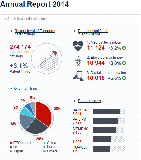 Πρίν λίγες ημέρες στις Βρυξέλλες, παρουσιάστηκαν τα ετήσια αποτελέσματα του ΕΓΔΕ για το 2014 από τον πρόεδρο Benoît Battistelli Για πέμπτη συνεχή χρονιά η ανάπτυξή του ιδρύματος συνεχίστηκε για αιτήσεις διπλωμάτων ευρεσιτεχνίας (+ 3,1% και σχεδόν 275 000 κοινοποιήσεις το 2014), που είναι ένα νέο ρεκόρ και επιβεβαιώνοντας την θετική τάση (+10 000 αιτήσεις για διπλώματα ευρεσιτεχνίας κάθε χρόνο κατά μέσο όρο).