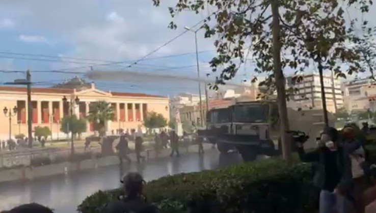 Όμως λίγα λεπτά αργότερα εμφανίστηκαν οι αύρες, τα οχήματα της ΕΛ.ΑΣ που ρίχνουν νερό και μαζί με άνδρες των ΜΑΤ «έσπρωξαν» τους συγκεντρωθέντες του ΚΚΕ ρίχνοντας μεγάλες ποσότητες νερού και χημικά προς την Ομόνοια.