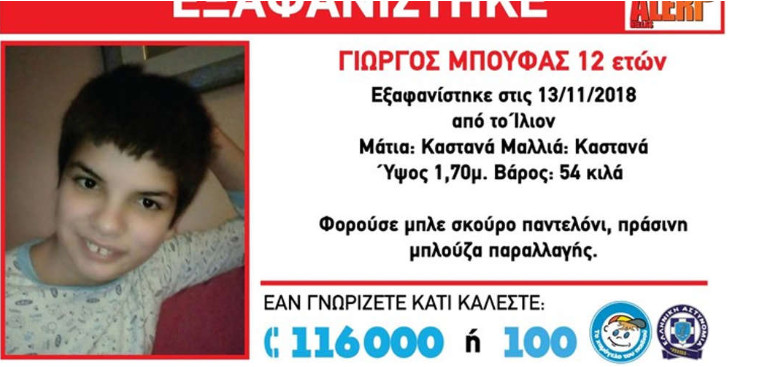 Επί ποδός είναι η αστυνομία τις τελευταίες ώρες για την εξαφάνιση του 12χρονου Γιώργου Μπούφα από την περιοχή του Ιλίου. Τα ίχνη του χάθηκαν το μεσημέρι της Τρίτης (13/11) στις 13.00.