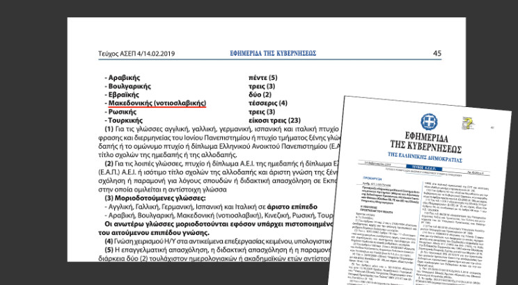 Ανάμεσα στις μοριοδοτούμενες ξένες γλώσσες για τους υποψηφίους είναι και η μακεδονική (νοτιοσλαβική) γλώσσα, όπως αναφέρει το ΦΕΚ. Αφορά τις πενήντα έξι (56) θέσεις του Κλάδου ΠΕ7 Μεταφραστών – Διερμηνέων – Ακροατών.