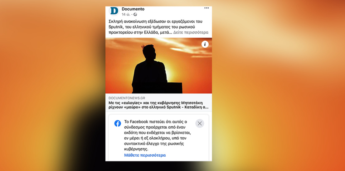 Συγκεκριμένα, κάτω από το post με τίτλο “Με τις ευλογίες και της κυβέρνησης Μητσοτάκη ρίχνουν μαύρο στο ελληνικό Sputnik”, το facebook εμφανίζει την εξής προειδοποίηση: