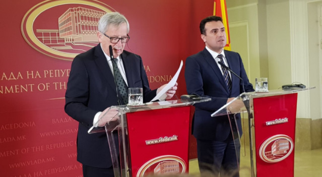 Ο πρόεδρος της Κομισιόν δήλώσε εντυπωσιαμένος από τη μεταρρυθμιστική πρόοδο που έχει πραγματοποιήσει η γείτονα χώρα και τόνισε την ανάγκη να συνεχίσει σε αυτό τον δρόμο και να λυθεί το θέμα του ονόματος με την Ελλάδα, σύμφωνα με ανάρτηση στο Twitter της αναπληρώτριας εκπροσώπου της Επιτροπής, Μίνα Αντρέεβα.