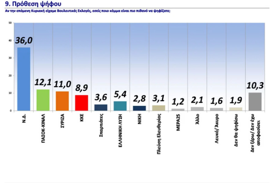 Αναλυτικά, η Νέα Δημοκρατία στην πρόθεση ψήφου συγκεντρώνει 36% και ακολουθούν το ΠΑΣΟΚ με 12,1% και ο ΣΥΡΙΖΑ με 11%. Στα άλλα κόμματα, το ΚΚΕ συγκεντρώνει 8,9%, η Ελληνική Λύση 5,4%, η Νίκη 2,8%, η Πλεύση Ελευθερίας 3,1%, το ΜέΡΑ25 1,2%, οι Σπαρτιάτες 3,6%, ενώ στο 10,3% είναι οι αναποφάσιστοι.