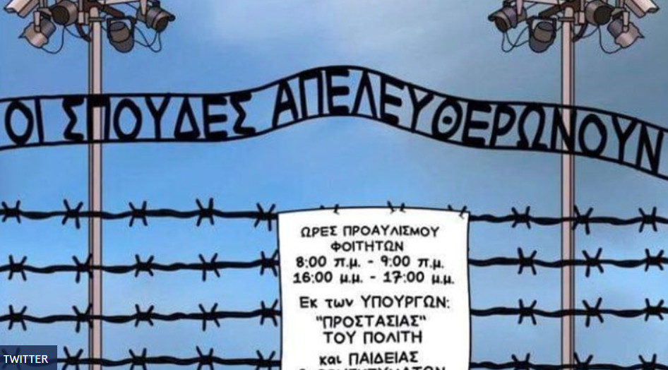 Σκίτσο της “Εφημερίδας των Συντακτών”, συγκρίνονται οι μεταρρυθμίσεις που προωθούνται από την κυβέρνηση για τα ΑΕΙ με το ναζιστικό στρατόπεδο συγκέντρωσης, Άουσβιτς.