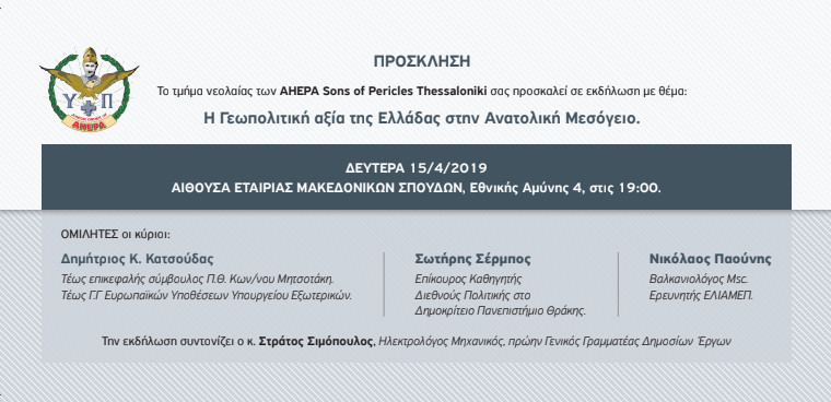 Η πρώτη εκδήλωση του νέο-ιδρυθέντος τμήματος της νεολαίας AHEPA Θεσσαλονίκης Sons of Pericles (HJ-03), με βασική θεματολογία την «Γεωπολιτική Αξία της Ελλάδος στην Ανατολική Μεσόγειο», θα φιλοξενηθεί την Δευτέρα 15 Απριλίου 2019 και ώρα 19:00, στην αίθουσα τελετών της  Εταιρείας Μακεδονικών Σπουδών (Εθ. Αμύνης 4).