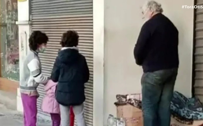 Άστεγος δίνει κέρματα σε παιδάκια που του είπαν τα κάλαντα.