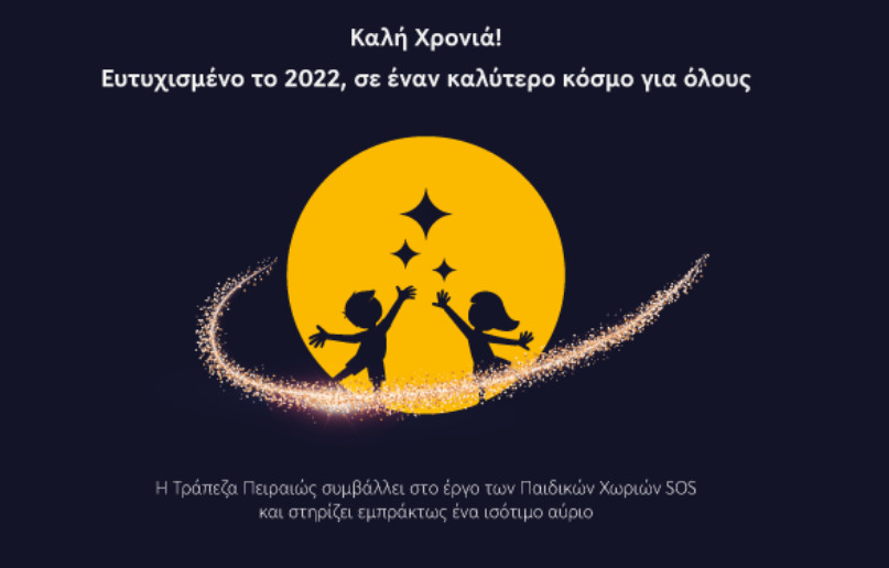 Φέτος τα Χριστούγεννα, η Τράπεζα Πειραιώς, αντί εταιρικού δώρου στους πελάτες και τους συνεργάτες της, συμβάλλει στο έργο των Παιδικών Χωριών SOS και στηρίζει εμπράκτως ένα ισότιμο αύριο για όλους.