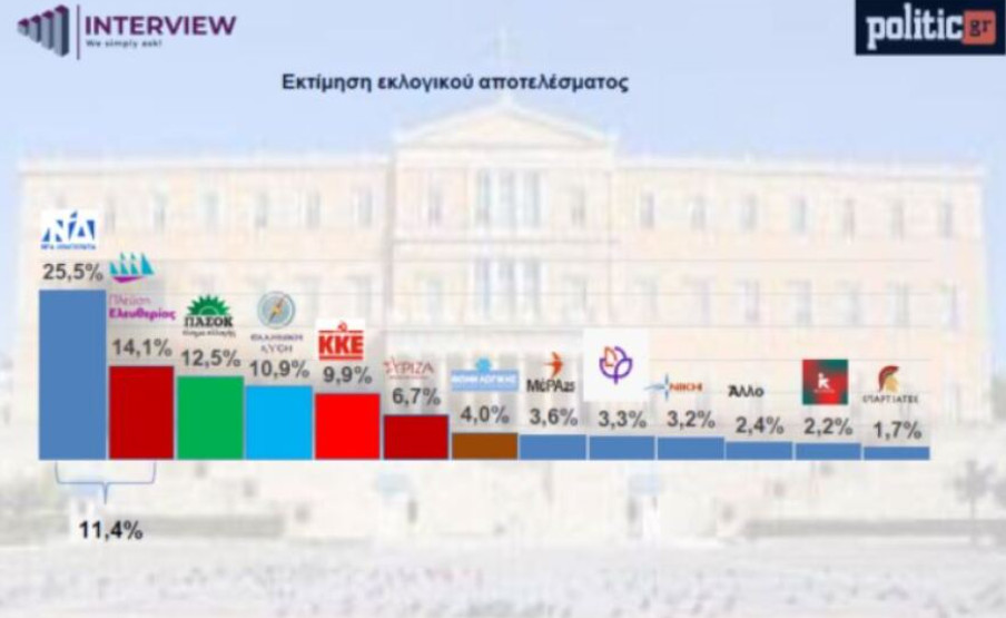 Πρωτιά της Νέας Δημοκρατίας με προβάδισμα 11,1% έναντι της δεύτερης Πλεύσης Ελευθερίας καταγράφει δημοσκόπηση της Interview για την ιστοσελίδα politic.gr.