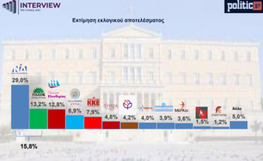 Άνοδο των ποσοστών της Νέας Δημοκρατίας κατά 2 μονάδες σε σχέση με την αμέσως προηγούμενη έρευνά της καταγράφει δημοσκόπηση της Interview για την ιστοσελίδα politic.gr.