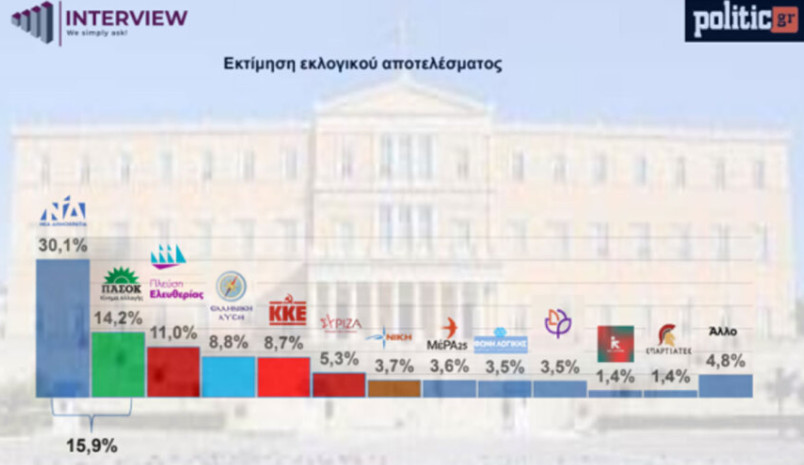 Στα επίπεδα του 30% κινείται η Νέα Δημοκρατία στη νέα δημοσκόπηση της Interview για την ιστοσελίδα politic.gr, με το κυβερνών κόμμα να έχει προβάδισμα 15,9% από το δεύτερο ΠΑΣΟΚ.