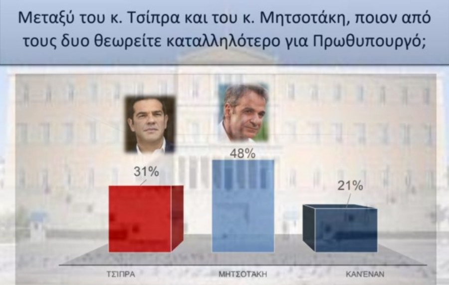 Η διαφορά μεταξύ των δύο ανέρχεται στις 17 μονάδες, με τον πρωθυπουργό να ανεβαίνει στο 48% (από 44%) ενώ ο Αλέξης Τσίπρας ο οποίος κερδίζει και αυτός μια μονάδα σε σύγκριση με την προηγούμενη δημοσκόπηση, βρίσκεται στο 31% (από 30%).