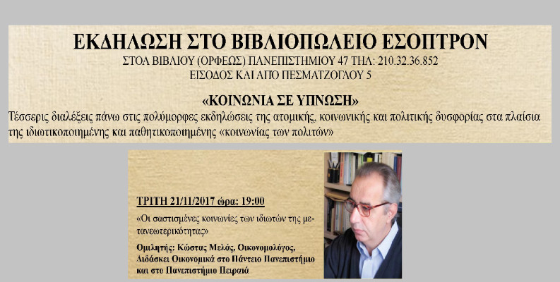 Τέσσερις διαλέξεις πάνω στις πολύμορφες εκδηλώσεις της ατομικής, κοινωνικής και πολιτικής δυσφορίας στα πλαίσια της ιδιωτικοποιημένης και παθητικοποιημένης “κοινωνίας των πολιτών” από τον Κ. Μελά στο βιβλιοπωλείο ΕΣΟΠΤΡΟΝ.