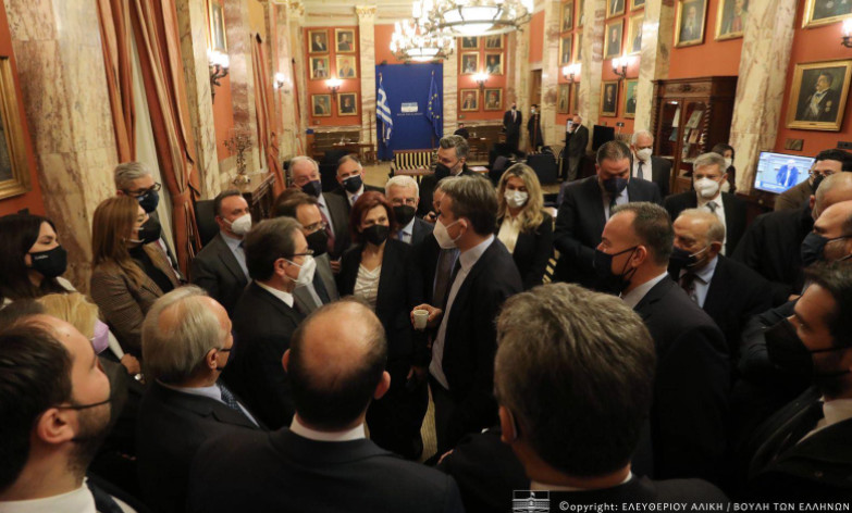Ο Κυριάκος Μητσοτάκης παρακολούθησε στην αίθουσα της Ολομέλειας την ομιλία του υπουργού Προστασίας του Πολίτη Τάκη Θεοδωρικάκου, ενώ στο εντευκτήριο είχε χαλαρή κουβέντα με πολλούς βουλευτές της ΝΔ που βρίσκονταν εκείνη την ώρα εκεί.
